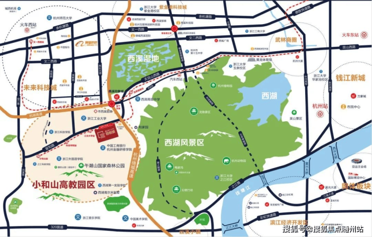 项目位于西湖区灵山景区东侧,北靠西山国家森林公园(车程10分钟),南邻浙江工业大学屏峰校区(直线500米),西接西湖大学云栖校区(规划中),东望小和山景区,三面环景,负氧离子充沛。作为地铁3号线屏峰站上盖物业,15分钟直达西湖、黄龙等核心区域,30分钟覆盖全城。
