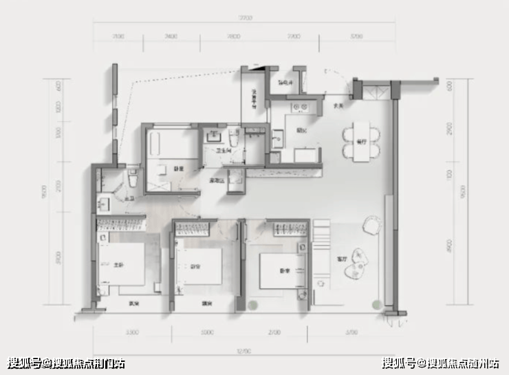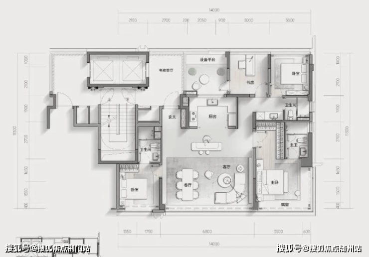 特别值得一提的是,户型设有独立电梯前厅,具备一定的私密性和收纳空间,电梯厅、设备阳台与书房互通,在可改性上也留有空间想象力。