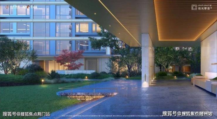 “一轴四境”的景观格局,将大堂、水院、花园、草坪等一一串联,绿洲与水系相伴,归家之路如桃源之境。 板块第一个半封闭式架空层, 兼容瑜伽、 健身、 亲子、 阅读等功能,