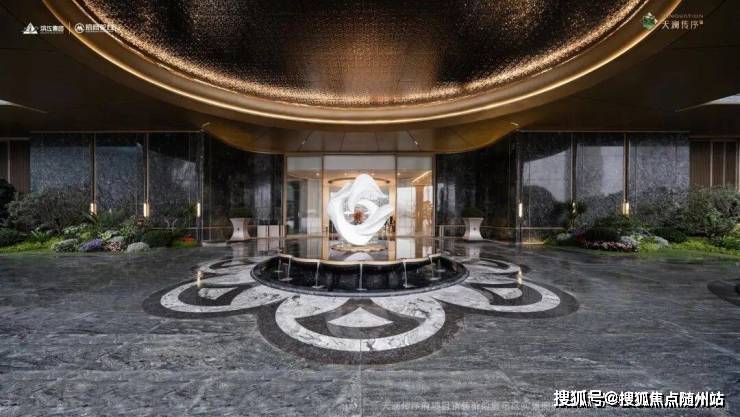 宽约35米、高约6.5米的寰宇云厅,如恢宏的殿堂般恭迎业主归家。这个将豪宅尺度、酒店式礼序与艺术美学融为一体的主入口,以苍穹为顶、以流光为幕,两侧挪威蓝翡翠石材景墙对仗而立,冰裂纹理间流淌着充盈、灵动的浪漫品位,呈现了宋代词人张孝祥笔下“万象为宾客”的气魄与胸怀。