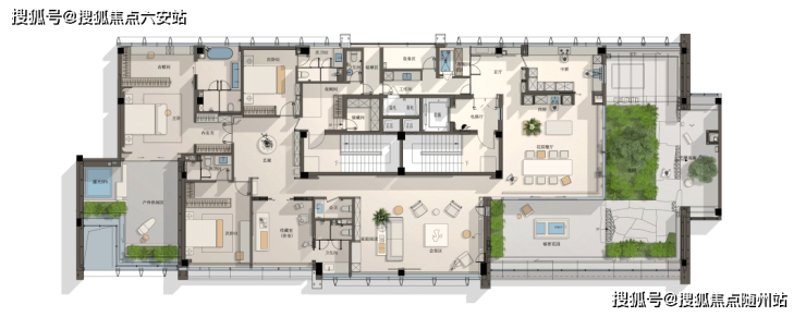 室内共4个户型各有特色,顶楼建筑面积约333㎡和建筑面积约357㎡的户型,约42m的面宽,相当于2/3个足球场的宽度,餐厅上方有天光倾泻而下,约250㎡的露台,像苏州园林般布局,主卧外还有个星空SPA池,躺在温暖的水流中,望着西湖群山听巴赫的《平均律》。