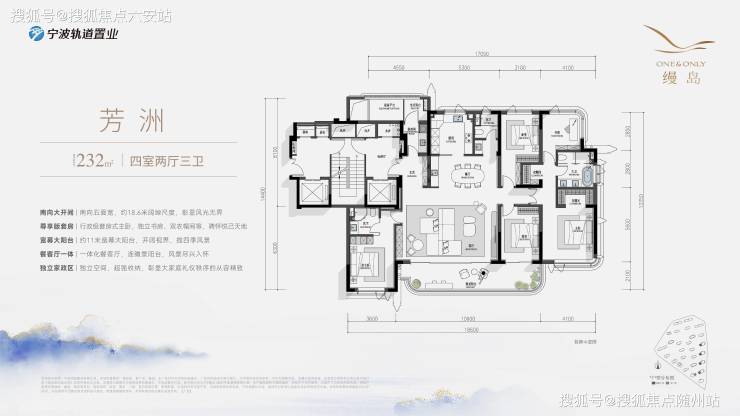 建面约232㎡滨水东首:270°环幕视野,18.6米南向开间,赠送60㎡私属露台,层高3.3米,私享东钱湖全景。