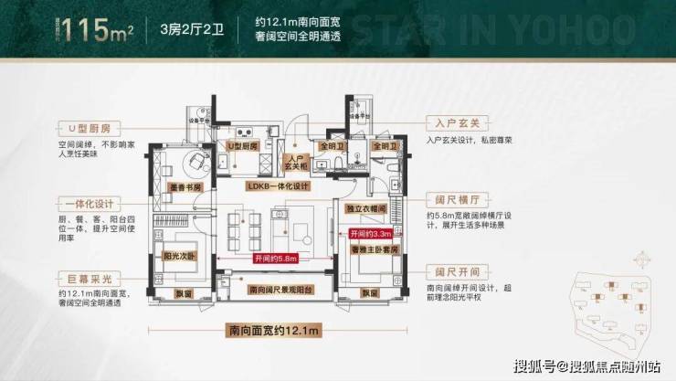 建面约115方三房两厅两卫,以三开间朝南搭配LDKB一体化阔厅,通过约27方餐客厅与观景阳台无缝串联,尺度彰显气势之外,与公区融合后,衍生出更多社交价值。