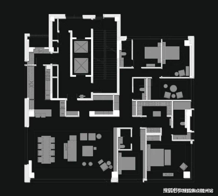 整个户型空间布局为4房4卫,三个大套房,每位家庭成员都能拥有自己的独立空间。