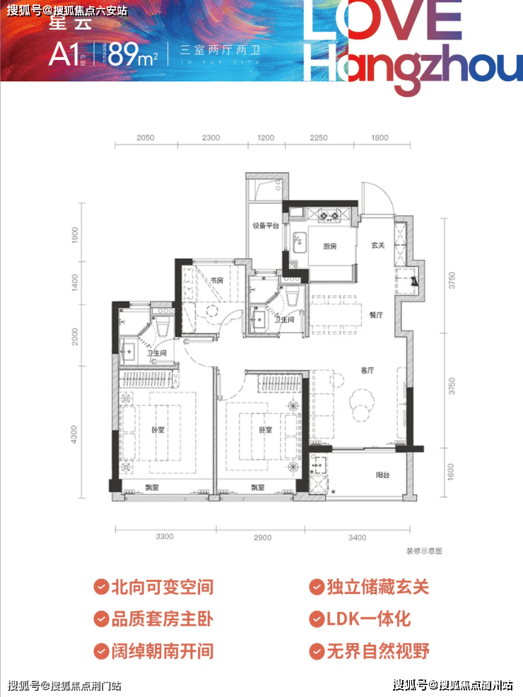 约6米宽景阳台衔接LDK一体化空间,书房可变儿童房,满足成长型家庭需求;