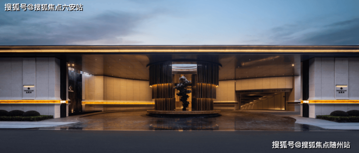 项目外立面采用双曲面石材与蓝灰色LOW-E玻璃组合,公建化设计搭配超高窗墙比。曲线才是豪宅的姿态——大量弧形和曲面设