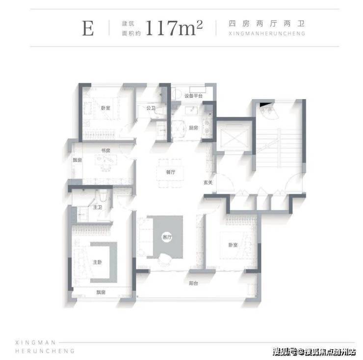 约117㎡户型点评:全明方正通透, 提升空间利用率,LDKB一体,营造大尺度餐客双厅, 亲朋从容相聚,双开间观景阳台, 晾晒之余, 亦可成为兴趣天地,四房功能, 让家庭成长的理想一步到位