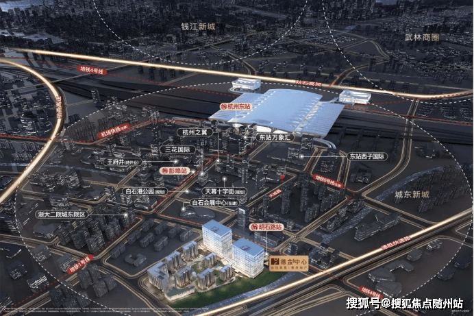 杭州火车东站除了是高铁枢纽中心,也是城市公交枢纽,更是目前杭州唯一地铁1号线、4号线、6 号线、机场快线等四条轨道交通交汇之地。由此可以迅速抵达全城各大核心区域,3站江河汇、4站武林、5站钱江新城,开启当代商务高效新篇。