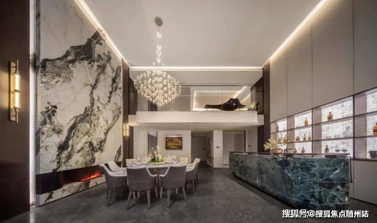 锦鲤池四周的墙面,用的也是奢石,名为「璀璨年华」;经常看房的人,可能会看到过同款——不过那大多是岩板,而这里,都是奢石「原版」。