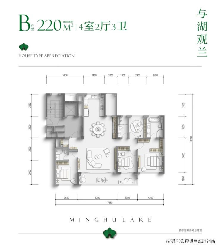 如建筑面积约220㎡户型,客厅拉开约6.3米开间尺度,餐客厨占近50%的户型空间比;