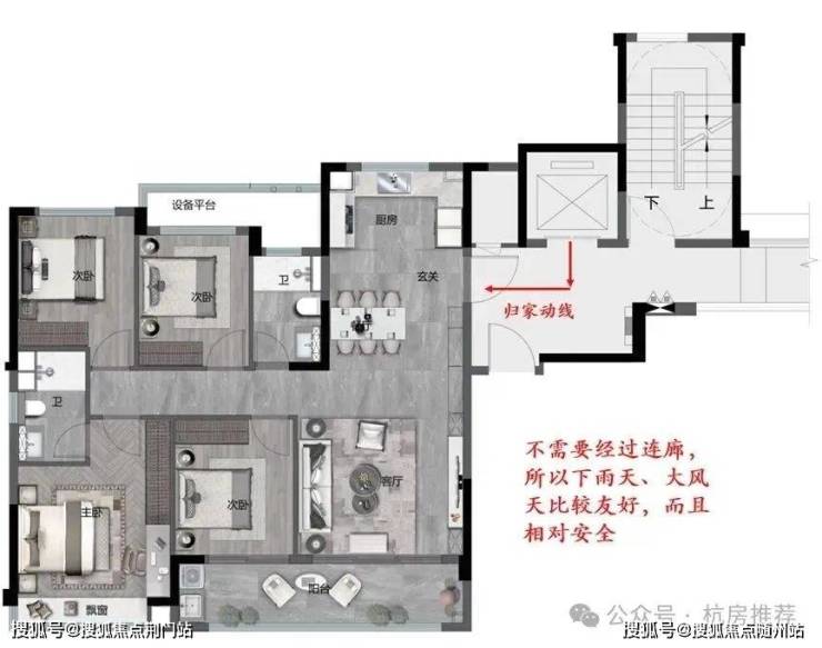 由于电梯的分开设置,连廊设置于中间,所以边套回家的时候不用经过连廊(见下图)。那么下雨天、大风天的时候就比较友好,也相对安全。