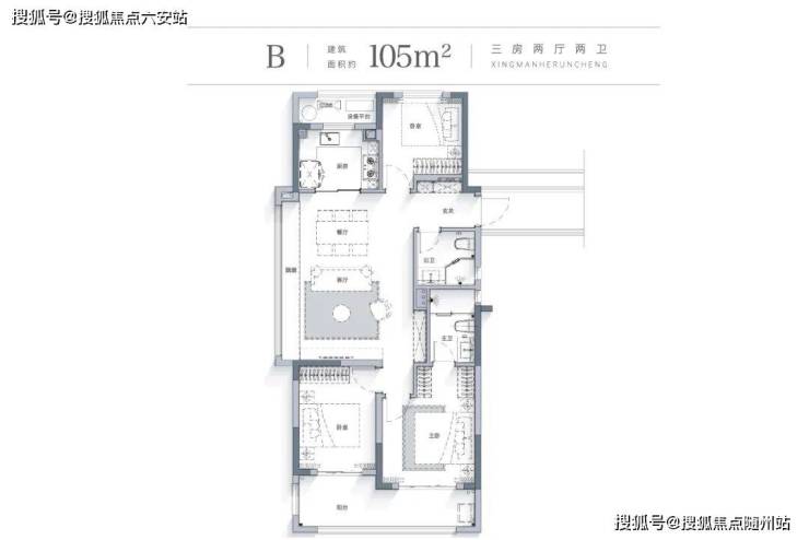 建筑面积约105方户型就设计出了备受年轻人喜爱的阔绰“横厅”,空间更加宽敞舒适。横厅的设计,让客餐厅融为一体,空间更开阔,增加了家庭聚会和娱乐的空间。
