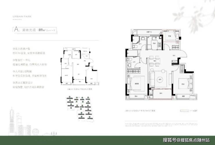 也因为这样,杭颂星澜府在户型的设计上更加游刃有余,主力的89方户型设计成了类四叶草的布局:动线合理、减少走廊的浪费、各卧室独立且私密。同时三开间朝南的设计,面宽达到了9.7米,主次卧均带有飘窗,采光充足,而且主卧为套房的布置,让生活更舒适。