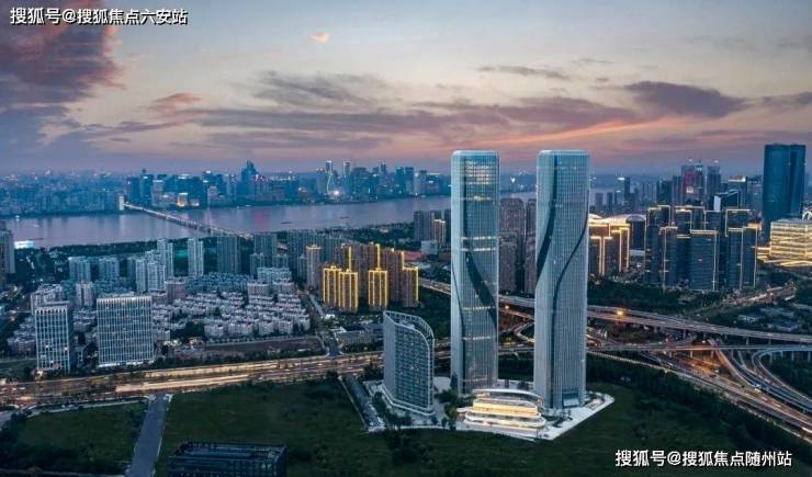 项目以272米超高层双子塔为核心,61层垂直空间以“钱江潮涌”为设计灵感,流线型玻璃幕墙结合光影变化,形成极具辨识度的城市雕塑群。