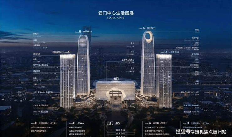 作为杭州西站枢纽南侧的TOD综合体,云门中心由新加坡鹏瑞利集团与滨江集团联合开发,总建筑面积约99.5万平方米,包含4栋超高层建筑(A塔320米、B塔300米、C/D塔213米)及80米高的云门地标。