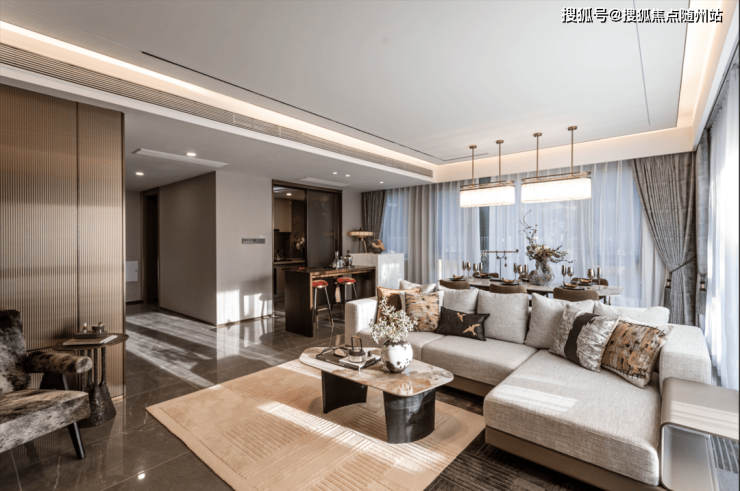 餐客厅空间宽裕,约14㎡的中西双厨房可以满足不同的美食需求,还留出了一个岛台的位置,一边连着餐厅和厨房,一边连着客厅,尺度感、生活情趣兼具。这个岛台,下厨藏着一份乐趣:你切菜来我烹饪,美食上桌,笑语盈盈。客人来了,或茶或红酒小酌,聊聊商务合作,氛围轻松,聊得畅快。