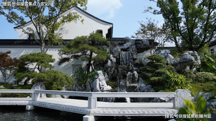 围绕着中心水院展开的造景,近景是流水、堆石,中景是连廊、假山,远景是中式合院的院墙、屋檐,丰富的视觉层次感,让人忍不住驻足观赏,感知四季流转。