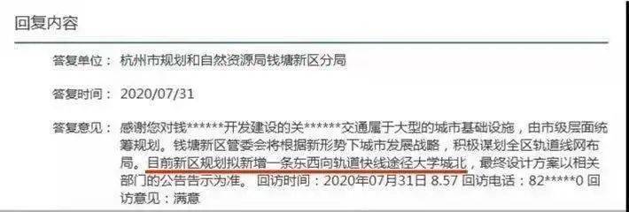 交通方面,项目紧邻德胜快速路,规划中的海宁长安至下沙的城际轨道,与本项目直线仅约300米,而这条轨交将直接与1号线相连,并联通萧山国际机场。7月末,杭州市规划和自然资源局钱塘新区分局在回复网友提问中表示:拟增加一条横穿大学城北的轨道快线,并在此设立站点。留在主城区,看见杭州的未来。