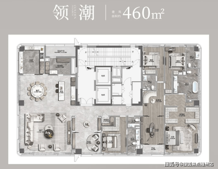 建面约410㎡【湾潮】:五房五卫,WSD世尊团队设计的“摩登东方”风格,4个套房+独立家政间,餐客厅面积达109㎡,隐藏式家政动线设计。