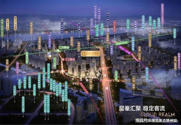 中南江一云境大平层傲立于滨江区的核心地带,紧邻地铁6号线江汉路站,周边交通网络四通八达,轻松畅达全城。项目占地面积约4.3万平方米,规划了多幢高层和商业建筑,形成了一个“立体多元宇宙”,让每一位居住者都能感受到云端之上的尊贵与舒适。