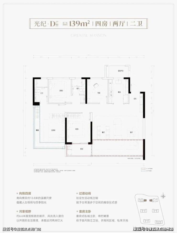 鸣澜里139平户型同样做的不错,打造四房两厅两卫,分为横竖两款,全部为边套,两梯两户设计。其中,139平竖厅户型亮点分析:①户型得房率超高,达到约93%;② 南向3个卧室,采光优且满足二胎家庭和三代同堂居住需求;③ 客厅面积达到约37平,足够大,同时额外配置约2.6平的储物间。
