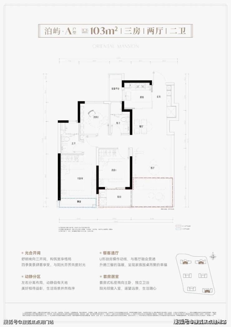 建面约103平,三房两厅两卫。三大亮点分析:① 南向三开间,朝南次卧带阳台,客厅联通阳台后,空间阔绰;② U型厨房且半开放设计,玄关含S墙冰箱位,利用率高、采光更优;③ 新规户型得房率高达约90%以上。