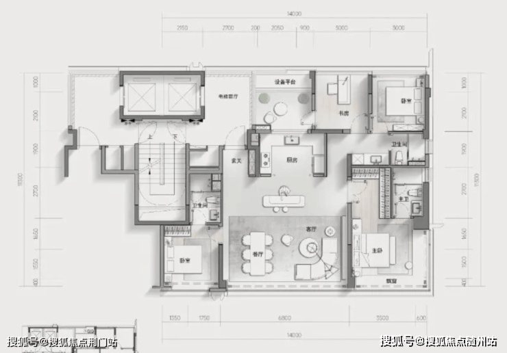 特别值得一提的是,户型设有独立电梯前厅,具备一定的私密性和收纳空间,电梯厅、设备阳台与书房互通,在可改性上也留有空间想象力。