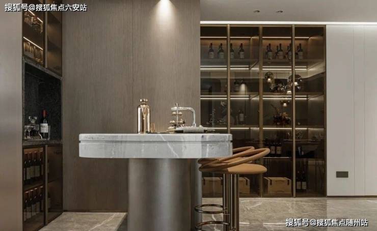 在餐厅,雲玺设置了一座长约2.4米的艺术岛台,白金沙天然石材配以金属底座,加之弧线的边角设计,弱化了封闭式岛台的厚重感,也更符合人体工学设计。