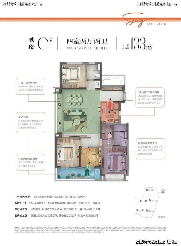 约106㎡户型点评:双联阳台约6.7米面宽,加设L型俯景面,满足晾晒、赏景、采光三重需求,LDKB一体化设计,打破各功能区域的隔离,整个空间更加开阔,开放式厨房 U型厨房,封闭敞开随心切换,高效台面设计,操作动线更加合理