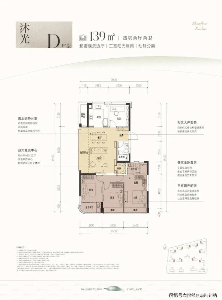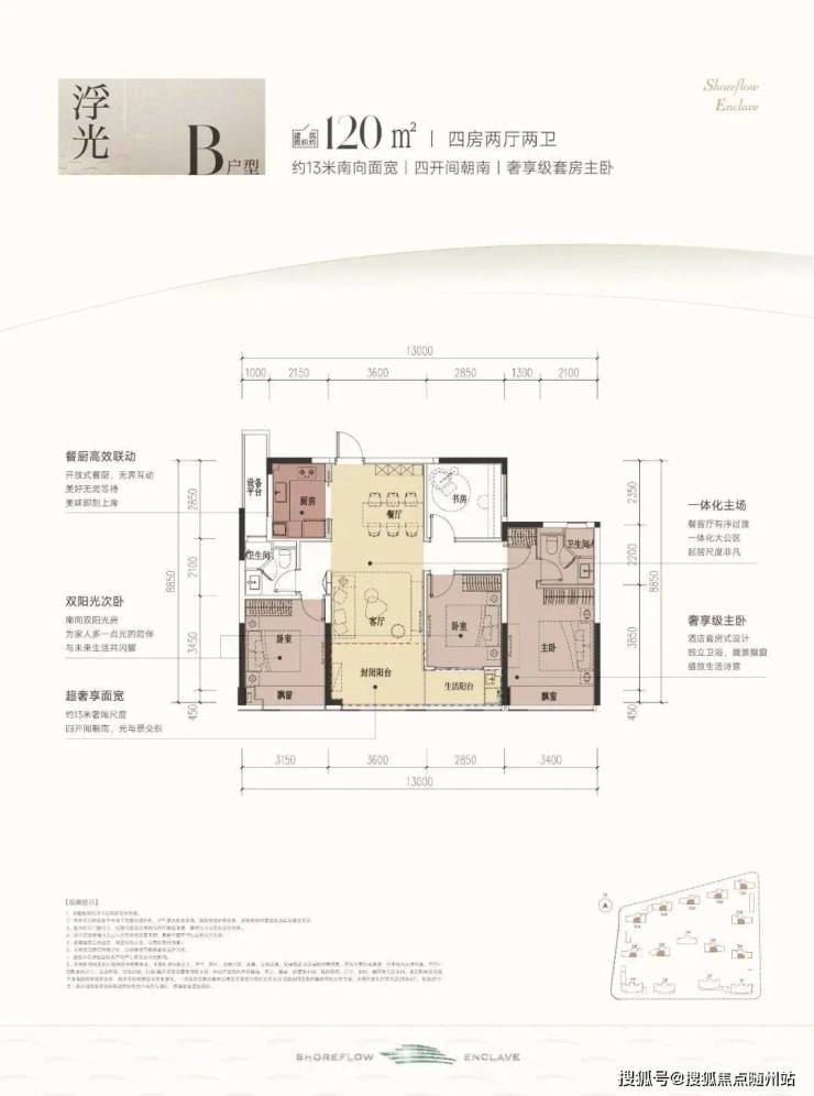约120㎡B户型做到四开间朝南,约13米南向面宽搭配双联阳台,套房主卧与双飘窗设计营造大平层气场。