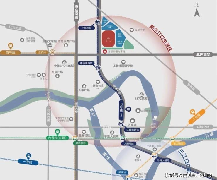 璀璨天鑫择址宁波江北核心区北岸板块,紧邻地铁4号线与规划7号线双轨交汇站(直线距离约800米),2站直达万象城商圈,5站接入宁波火车站,10站通达宁波栎社国际机场。作为宁波“拥江揽湖”战略核心承载地,项目坐拥姚江科创走廊与文创港产业带双辐射,未来价值不可限量。