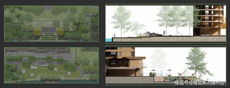 从落客区的水景到多个主题庭院,景观设计上利用跌水、浅滩、旱溪等不同水的形态与形式,营造贯通示范区的水脉。通过台地叠瀑结合下沉庭院的手法,形成引水入园的活力水境,既有效隔绝喧嚣,亦叠合平台功能,丰富空间体验的层次感。