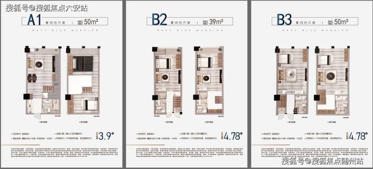 项目主打“双钥匙LOFT”产品,建面约33-50㎡户型,层高4.75-4.79米,采用独立双入户设计,上下层均享3.5米舒适空间,实现“买一层享两层”的高利用率。