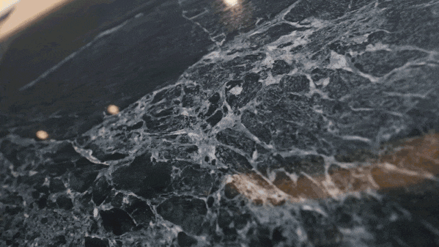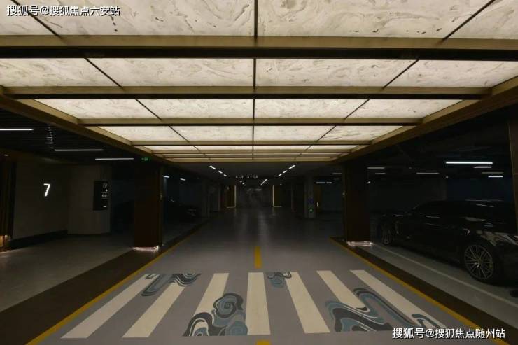 结束一天的疲惫,驱车归家的路上,车库是品质生活的延展。目之所及坡道两侧,三块精准对纹岩板如泼墨山水,铝方通与透光灯膜交织流动光影。