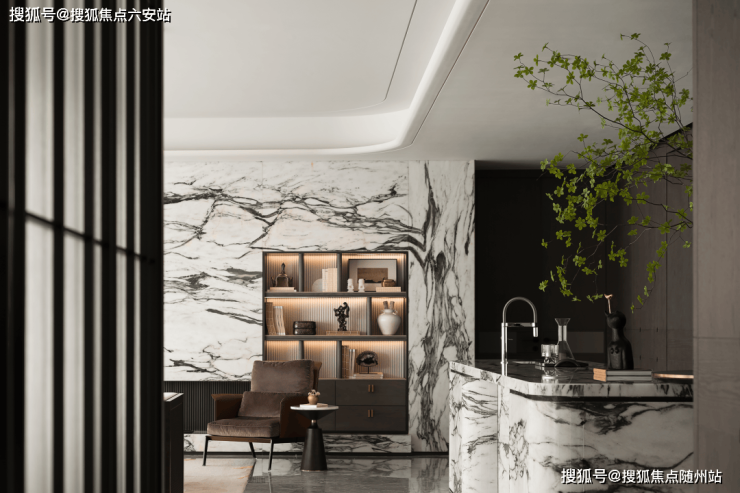 以350㎡户型为例,玄关背景采用“森林绿”。以一整面森林绿大理石背景墙做视觉隔断,搭配两侧艺术造型的皮革硬包,观感上既没有大面木质隔断的厚重,又不失新中式应有的华丽。