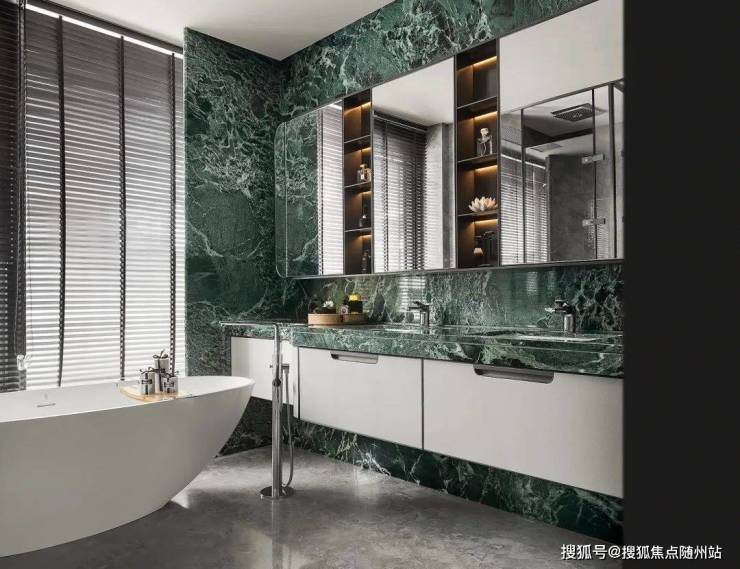沿着木纹而生的大理石干泡台蜿蜒出灵动的曲线,流觞曲水的风雅被迎进室内。银壶盛满至洁的秉性,独立的衣帽间、化妆台,卸下铅尘繁杂,转头可见圆融如“不系舟”的浴缸,百叶窗保护隐私又不影响欣赏美景,让温热的芬芳包裹自己,享受全身心地放松,爱自己是要终身修习的浪漫。