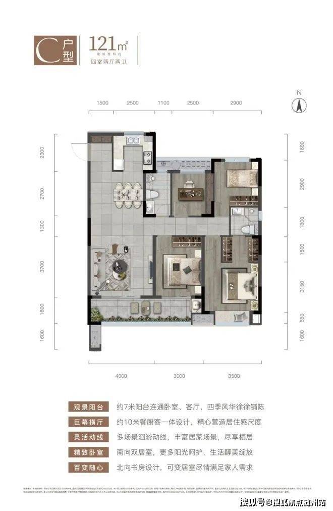 建筑面积约108㎡动静分区,U型厨房、约7米南向阳台尽显生活惬意;建筑面积121㎡舒阔四房,玄关入户收纳有度、餐客一体巨幕横厅,尺度感俱佳。