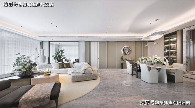 东区建面约320户型,将艺术感进一步融入日常中。特别设计的专属门厅空间,是从电梯厅延伸到家,如同一处艺廊,放慢人的情绪;室内选用了浅金色奢石(外界也称其为“芬迪白大理石”)作为主要的石材,曲面的木饰面也为浅色,整体给人以明亮感。