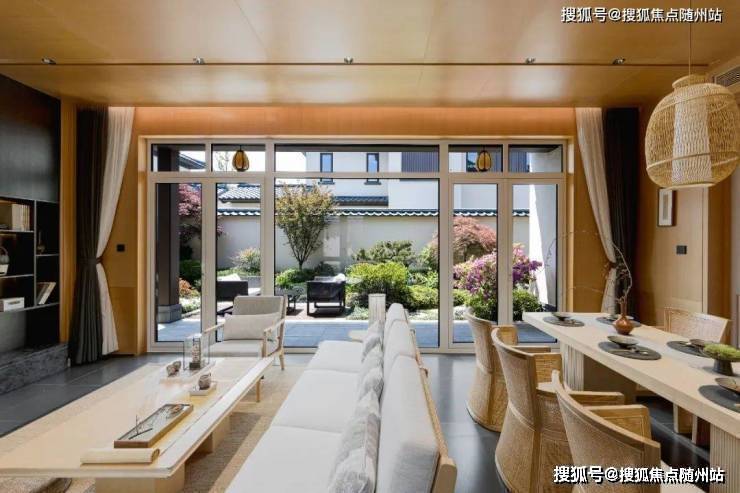 一层的客厅长约7.2米,庭院内的景致尽收眼底。