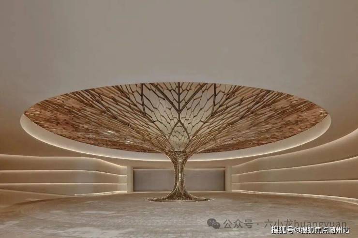 大堂「生机之亭」高约15米,凌空矗立为归家动线的核心枢纽。藤蔓枝干与天花交织缠绕,地面与顶面纹理呼应,共织以森林韵律为魂的生态栖居归家仪式。