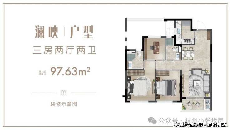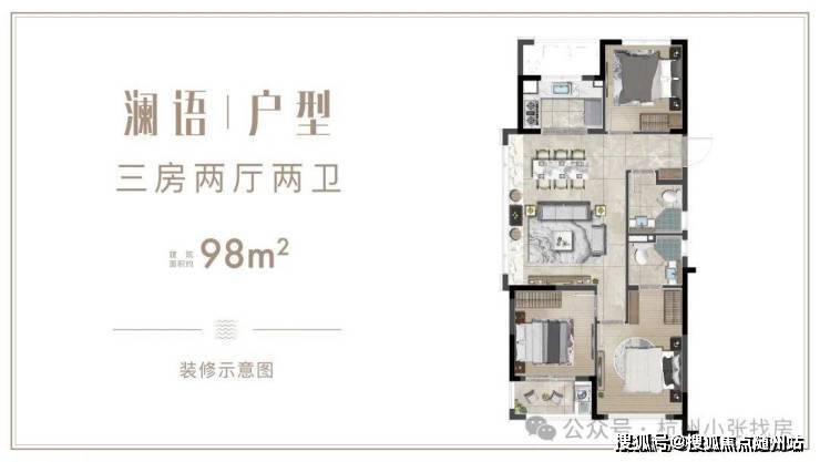 98㎡三房两厅两卫户型,大横厅布局,三房配置,自在生活从容有度;阔景飘窗,冥思品茶优渡闲暇时光。