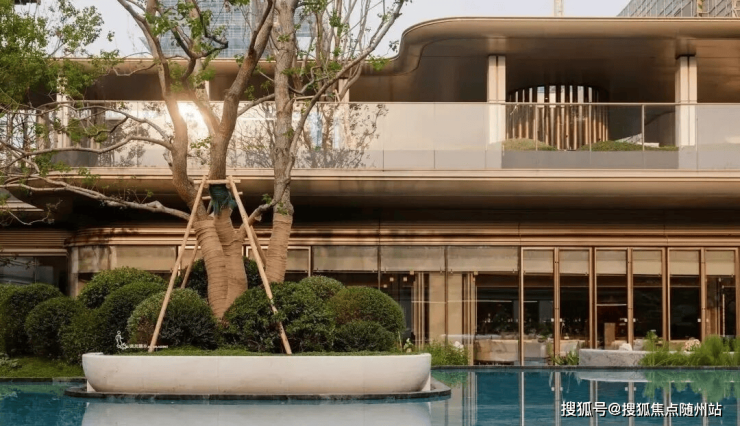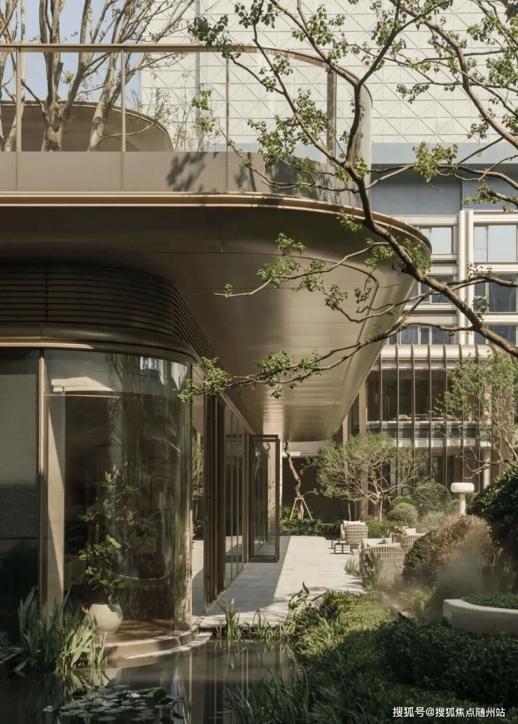 庭院景观以西湖荷花为核心设计元素之一,水桥的形态则借鉴并转译西溪湿地的自然肌理,使整体空间在文化意象与自然特征之间建立关联。