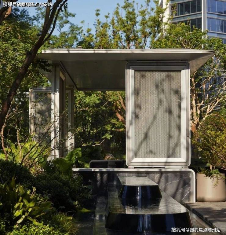 走入T-ONE潮博西区的园区,可以看到一条蜿蜒的水系串联着不同场景,贯穿整个楼盘。在这里,是结合了杭州「钱塘江潮」的在地文化,用溪流与叠水打造出了一座很有度假感的花园。花园中,凡是有户外座椅的地方,就会有微风、树荫与水流的环绕。