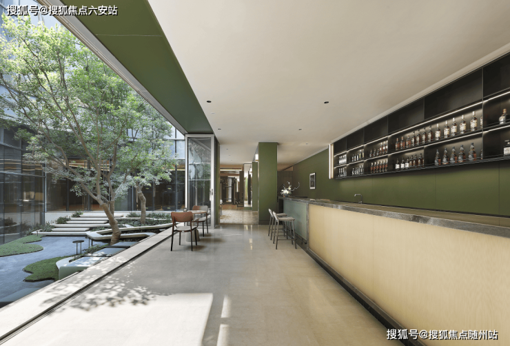 T-ONE潮博西区的会所室内设计,在T-ONE潮博西区的大堂里嵌入了一个下沉式露天花园,用几株乌桕来显现四季变化。用一条回廊让室内恒温泳池、酒馆式吧台、健身房、瑜伽室等空间像行星一般围绕着露天花园。
