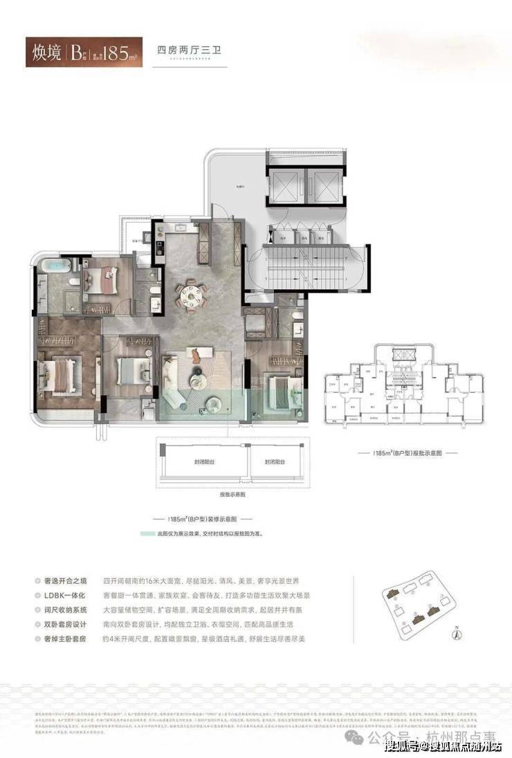 建面约185㎡与230㎡户型,均实现约16-17米的南向超大面宽,可布置三间南向卧室与阔绰客厅。设计上采用双套房、多卫布局,建面约230㎡户型主卧面宽达4.3米以上,兼顾亲密与独立。