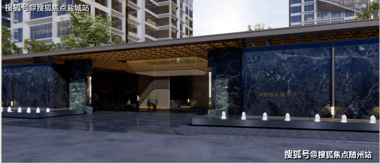 建筑立面现代挺拔,采用全铝板贴面,符合高端办公和公寓的配置,在此基础上,改造内容包括:大堂出入口、增加楼栋首层泛会所、增加公共会所泳池、优化园区标志性主入口。主入口采用干挂芬迪黑石材、普拉达绿石材、古铜色铝板等进口材料,整体现代且华贵,灯光点缀,调性高雅,近人尺度细节丰富,打造豪华入口,提升尊贵体验感。