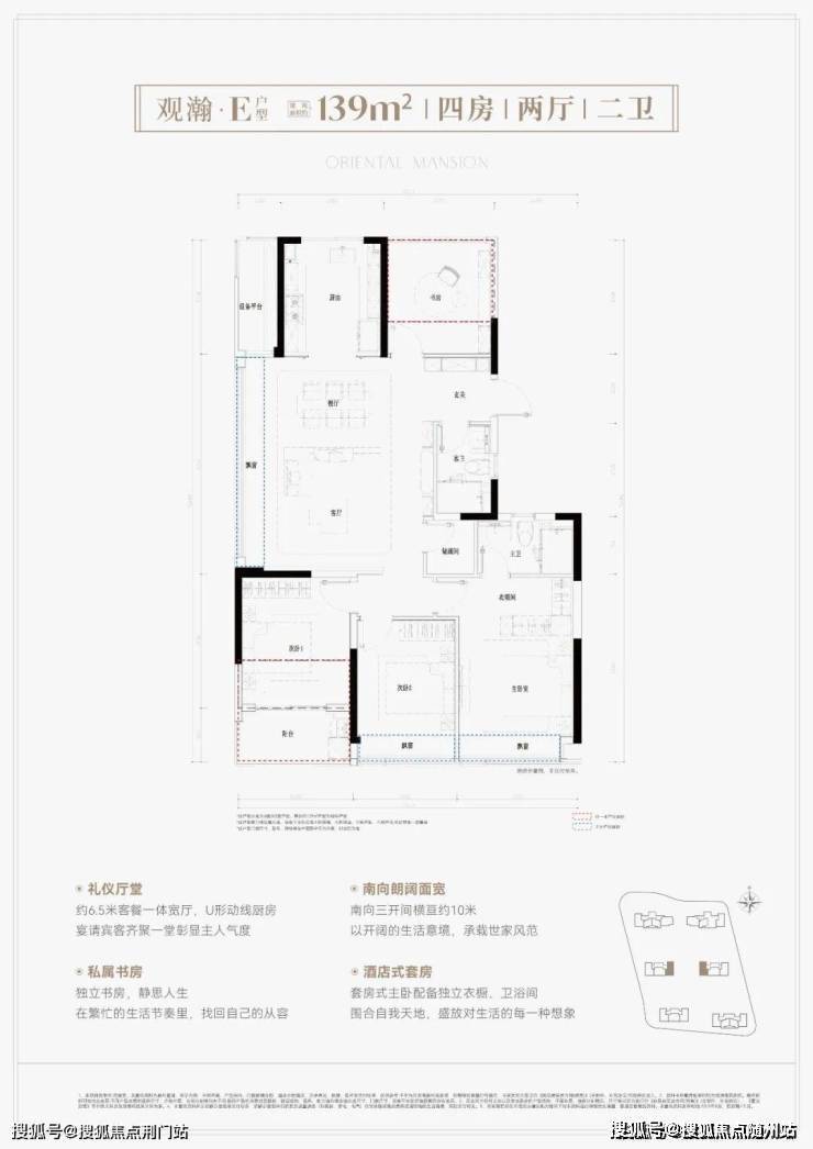 鸣澜里139平户型同样做的不错,打造四房两厅两卫,分为横竖两款,全部为边套,两梯两户设计。其中,139平竖厅户型亮点分析:①户型得房率超高达到约93%; 南向3个卧室,采光优且满足二胎家庭和三代同堂居住需求;③ 客厅面积达到约37平,足够大,同时额外配置约2.6平的储物间