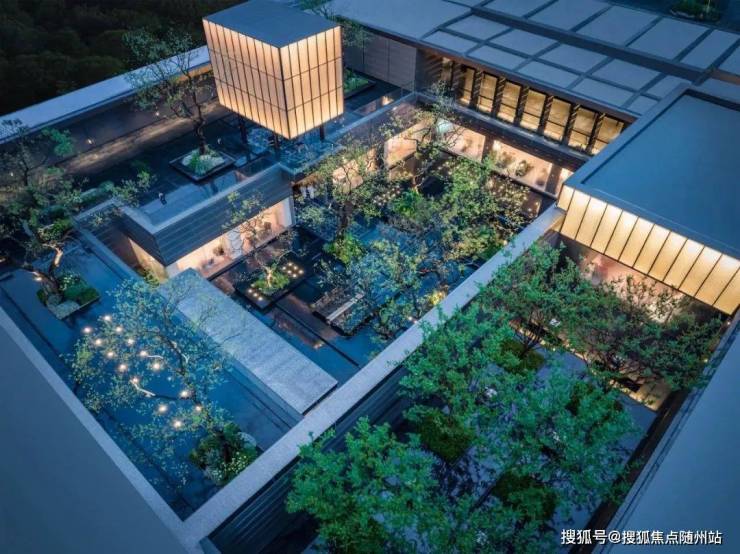 保利明湖金茂府是把回廊、大堂和大门串联在一起,形成一整个「地面大堂系统」;又把地面和下沉式庭院嵌套在一起,共享同一片乌桕林的好风景。