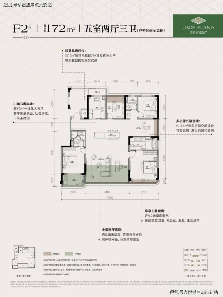 建面约172㎡F1户型,4房2厅3卫,含赠送得房率约96%。