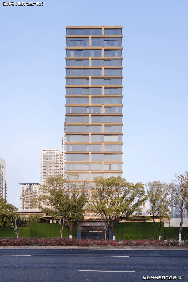 钱潮湾的建筑设计以“钱塘江潮涌”为灵感源泉,由line+建筑事务所操刀,将自然元素的动态美转化为建筑语言。外立面采用金色铝板曲面线条与大尺度玻璃幕墙相结合,形成如潮水般层层推进的流动韵律。竖向线条密度自下而上逐渐疏朗,对应基座稳重与高区通透的建筑逻辑,既体现了力学美感,又契合了不同楼层的功能需求。